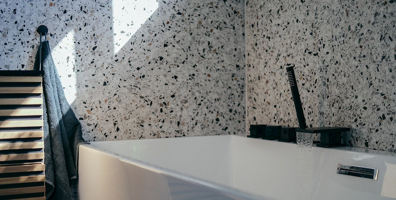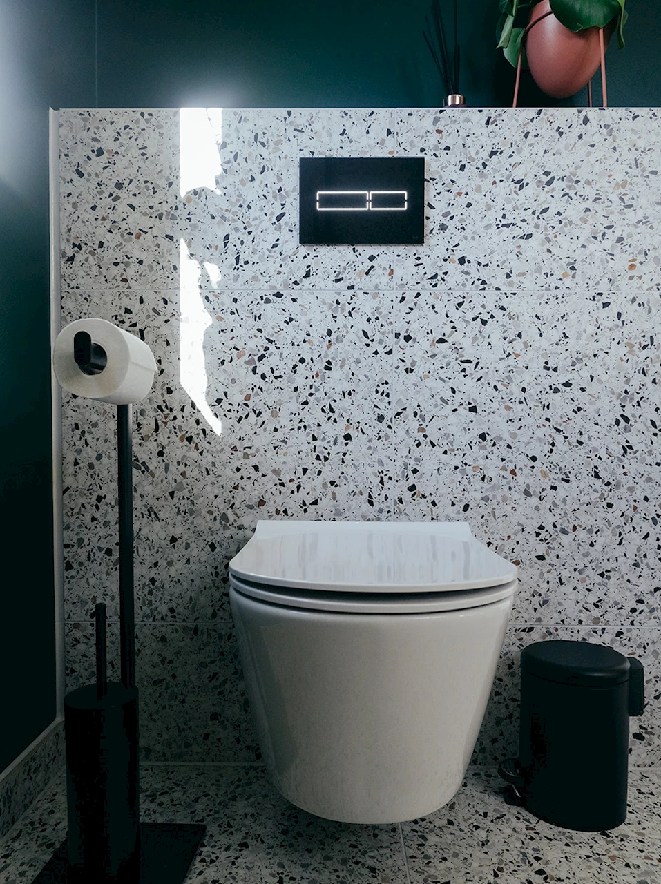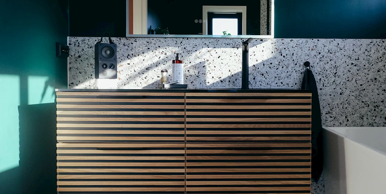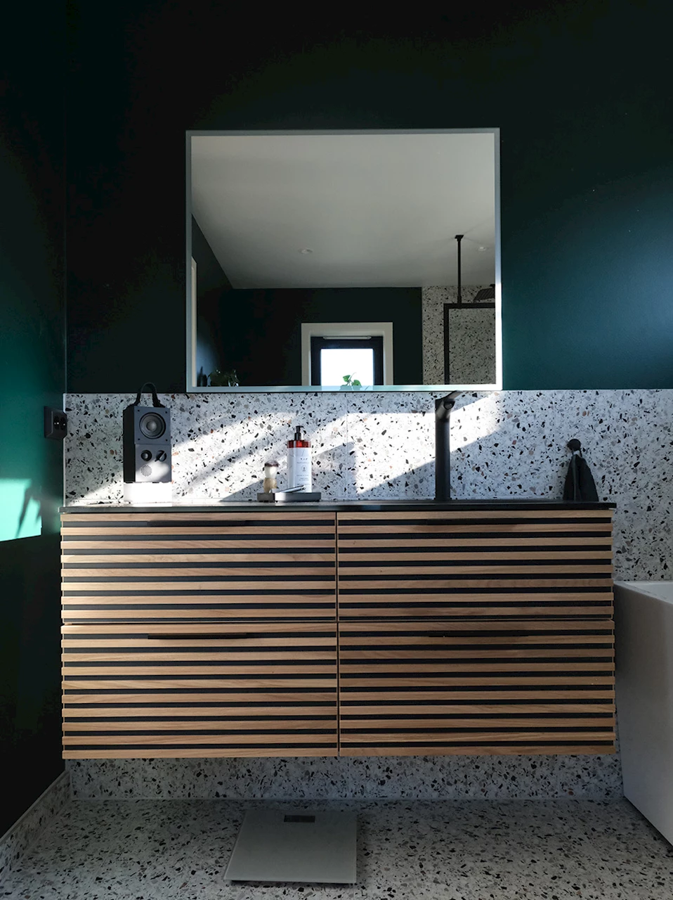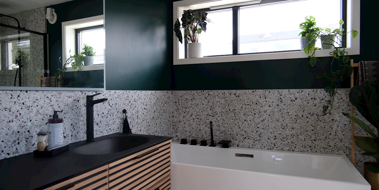 - Vi ønsket oss noe mer dempet og luksuriøst enn et hvitt og sterilt bad, og gikk for sorte detaljer og mørkt tre som sto godt i stil til terrazzo-fliser og grønne vegger.