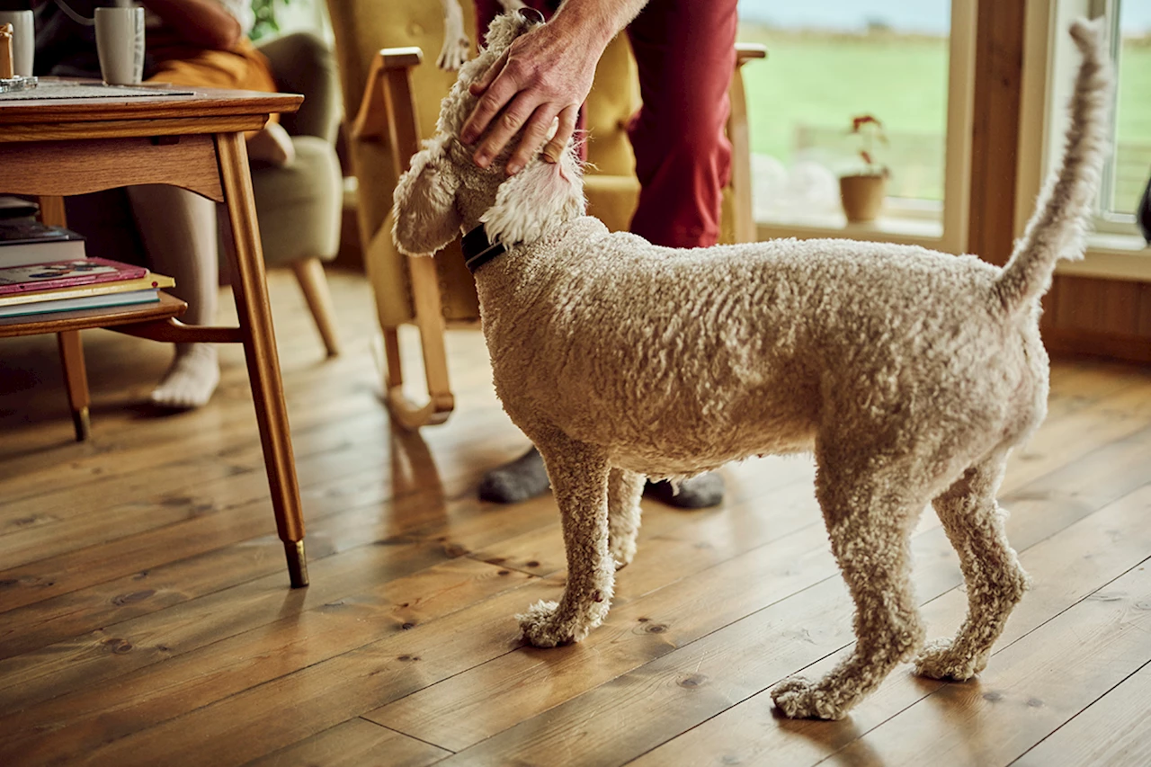 - De firbeinte er ikke veldig lei seg for varmt gulv. Spesielt hun her er veldig varmekjær og liker godt å ligge på det varme gulvet, sier Siri Vik og klør hunden Ebba bak øret.