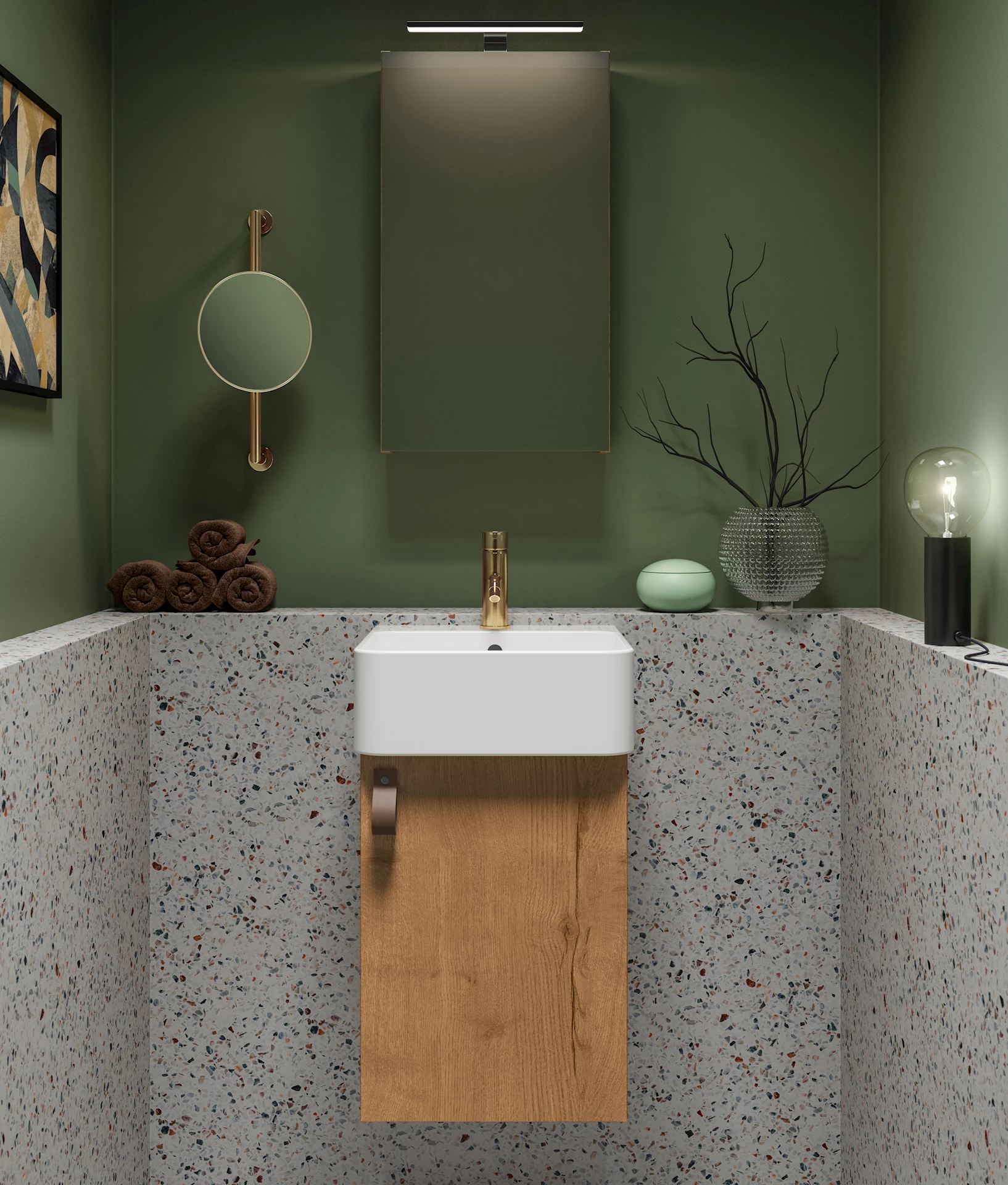 På bad som er mindre enn 5 kvadratmeter er det de plassbesparende løsningene som gjelder! Toalett som bygger minst mulig, smale baderomsmøbler (det er også mulig å velge møbler med dybde 35 cm), dusj med foldedører som kan slås inn når den ikke er i bruk, god belysning og speilskap som gir følelsen av et større rom.