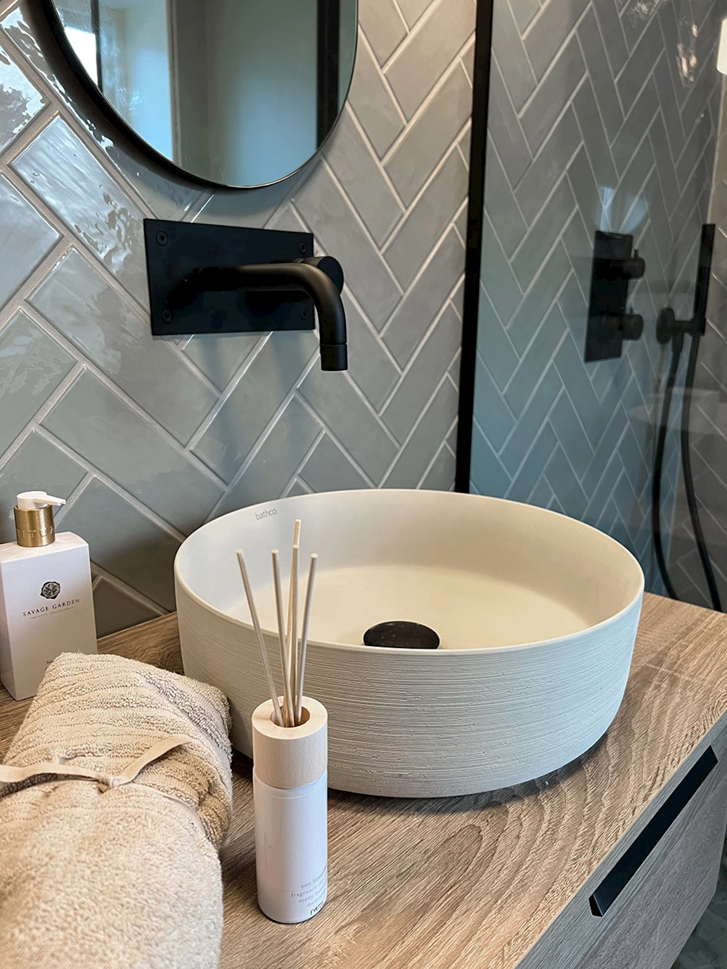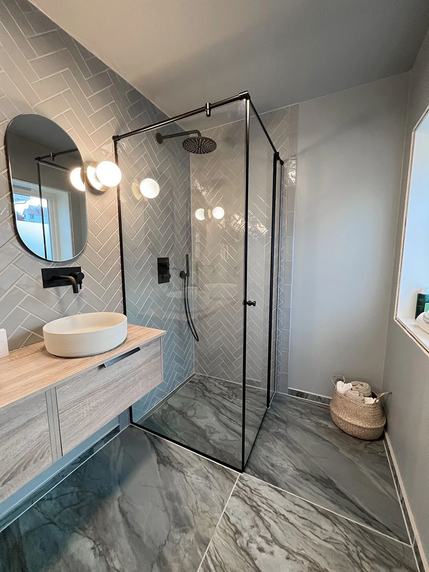 De valgte svart dusjhjørne for å få kontrast til de duse fargene på vegger og gulv, og møbel i eik for å gi rommet varme. Sidesluk bidrar også til at badet ser renere og ryddigere ut.