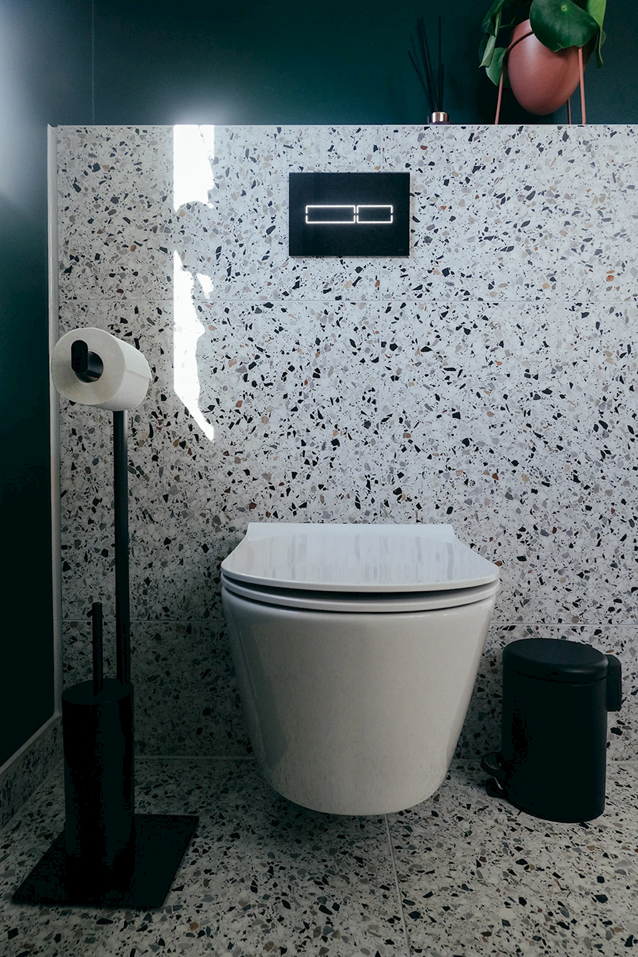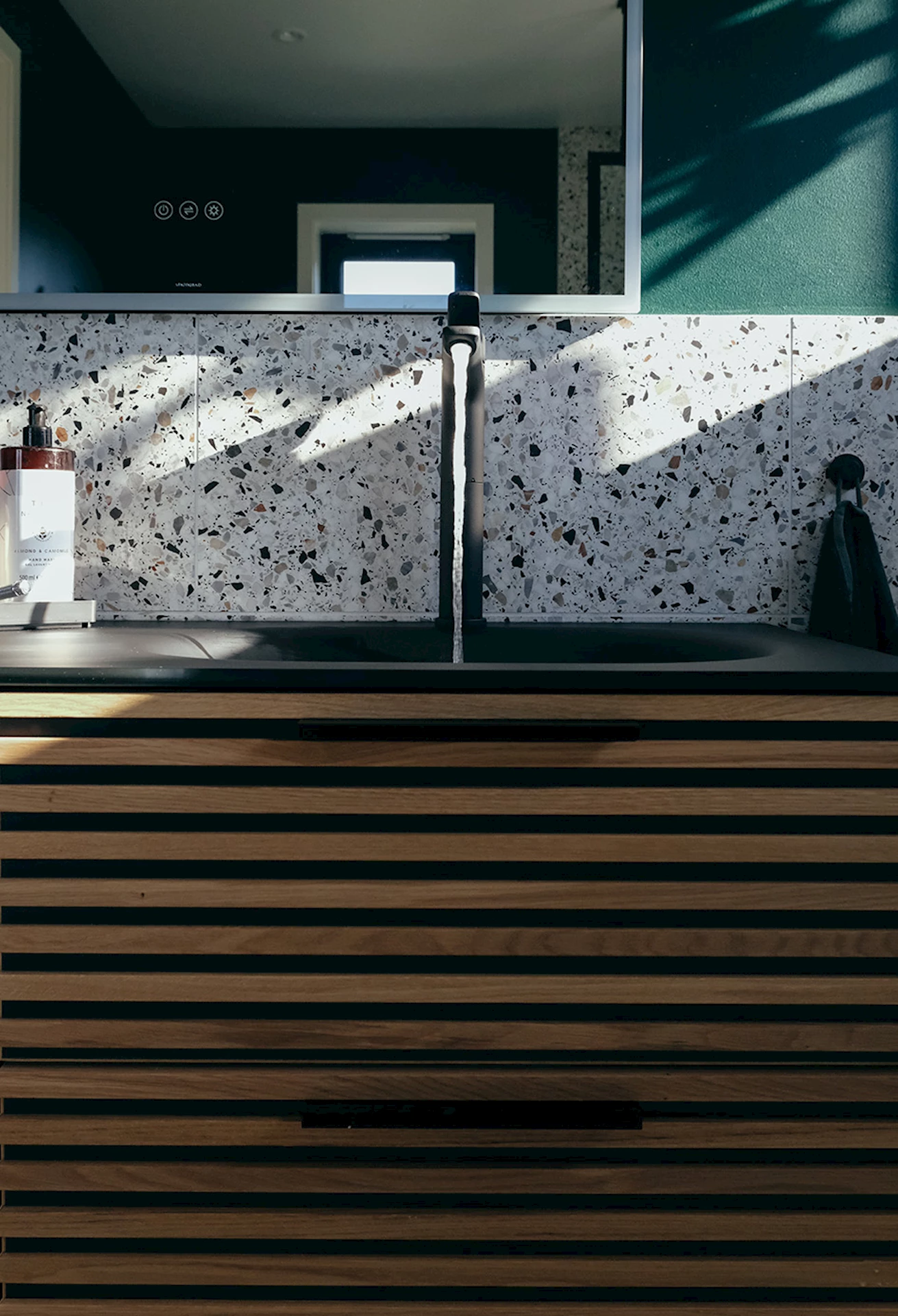 - Vi ønsket oss noe mer dempet og luksuriøst enn et hvitt og sterilt bad, og gikk for sorte detaljer og mørkt tre som sto godt i stil til terrazzo-fliser og grønne vegger.